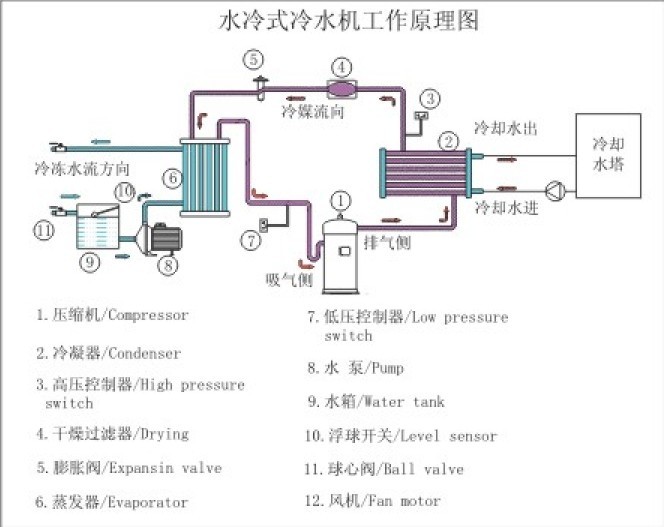 水冷式冷水機(jī),運(yùn)行更為平穩(wěn),冷量損失少,易回油,傳熱管不易發(fā)生凍裂,比風(fēng)冷機(jī)能效高。但水冷機(jī)占地廣,且在價格上要比風(fēng)冷高一些。在選擇冷水機(jī)時一定考慮客觀環(huán)境因素,選擇合適的類型。